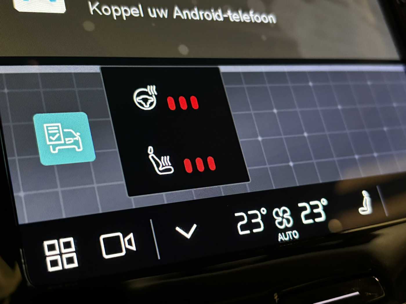 Schakelpookknop in simili-leder bekleed, Blond dakhemelbekleding, Metal Mesh aluminium sierinleg, Leerbekleding, Simili-leder stuurwiel Charcoal, Comfortzetels vooraan, 8-traps Geartronic-automaat, Pedalen, Bijkomende aparte klimaatregeling voor de 3de zetelrij, Klimaatregeling met 4 temperatuurzones, Naloop parkeerklimaat, Uitschakelbare passagiersairbag vooraan, Bestuurders- en passagiersairbag, Knieairbag. bestuurderszijde, Road Sign Information , Lane Keeping Aid met Run-off Road Mitigation, Sportieve radiatorrooster met omlijsting en horizontale lamellen in Glossy Black, Verwarmd grille-embleem, Full LED koplampen met Active High Beam, Hogedruk koplampreinigingsinstallatie, Controle aanhangerverlichting, 12.3-inch bestuurdersdisplay, Google Assistant. Google Maps en Google Play Store – 4 jaar inbegrepen, Adaptive Cruise Control, Pilot Assist, Snelheidsbegrenzer, Afstandsbedieningsfuncties Volvo Cars-app - 4 jaar inbegrepen, Geventileerde subwoofer, DAB+ (Digital Audio Broadcasting), Harman Kardon audiosysteem 600W met 14 luidsprekers, Buitenspiegels elektrisch inklapbaar, Geheugenfunctie voor de zitpositie van de passagierszetel vooraan, Draadloos oplaadsysteem voor smartphone, Automatische portiervergrendeling, Transpondersleutel, Buitenspiegelkappen in contrastkleur Solid Black, Dubbele vergrendeling, Donkergetinte achterruiten, Blind Spot Information System (BLIS™) met Cross Traffic Alert, Elektrisch bediende kindersloten op achterdeuren, Elektrisch bediende kofferklep, Keyless Entry met handenvrije opening/sluiting van de kofferklep, CleanZone met geavanceerde luchtreiniger PM 2.5, Digitale gebruikershandleiding, Systeemtaal Vlaams, Textielmatten. derde zitrij, Bovenzijde dashboard bekleed in simili-leder, Elektrisch bediende bestuurderszetel met geheugenfunctie, Elektrisch bediende passagierszetel, Verwarmbare voorzetels, Verwarmbare achterbank (buitenste zitplaatsen), Elektrisch bediende buitenste hoofdsteunen achterin. tweede zitrij, Zevenzitsconfiguratie, Achterzetels met afzonderlijk neerklapbare rugleuningen, Lendensteun vooraan elektrisch regelbaar in 4 richtingen, Premium vloermatten voor- en achteraan. Charcoal, Nylon veiligheidsnet tussen achterbank en bagageruimte, Opvouwbare laadvloer/laadruimteverdeler met boodschappentashouders, Centrale armsteun achteraan met doorsteekluik, Geïntegreerde zittingverhoger in middelste zitplaats 2e zitrij, Verlichte make-upspiegels, Interieurverlichting Pro, 12V stopcontact in de bagageruimte, Automatisch openend/sluitend bagagescherm, Zongordijnen. geïntegreerd in de achterdeuren, Buiten- en binnenspiegels met automatische dimfunctie, Verborgen opbergruimte, Voorzetels met elektrisch verlengbaar zitkussen, Hill Start Assist, Tyre Pressure Monitoring System, Actieve chassisregeling met luchtvering, Oncoming Lane Mitigation, Rear Collision Warning, Hill Descent Control, Waarschuwing voor glad wegdek, Noodremlichten, Verwarmbaar stuurwiel, Instelbare stuurbekrachtiging, 20″ met 5 multispaken. Black/Diamond Cut. vierseizoenbanden (1259), Recharge™ tyres (all-season), Bandenreparatiekit, Wisserbladen met geïntegreerde sproeiers, Op de carrosseriekleur afgestemde portiergrepen met grondverlichting, Glanzend zwarte sierelementen aan de voorzijde, Aluminium laaddrempelbeschermer, Verlichte Recharge aluminium instaplijsten. voor, Glossy Black zijruitomlijsting, Glossy Black geïntegreerde dakrails, Getemperde zijruiten, Park Assist vooraan. achteraan en opzij, Tickethouder, Parkeerverwarming op brandstof met timer, Trekhaak met halfautomatische wegklapfunctie, 360 graden camera met bovenaanzicht, Brandblushouder, Wieldoppenset. Matt Tech Grey, Apple CarPlay, 9-inch middendisplay, Laadkabel monofase 16A mode 3 (type 2) met Mennekes contactstekker (voor laadpaal). 7 meter, Whiplash Injury Protection System, Gordijnairbag, Zijdelingse bescherming, ISOFIX bevestigingspunten: buitenste zitplaatsen achteraan, Veiligheidsgordels, Regensensor, Stuurwielbediening, Vochtigheidssensor, Start/Stopsysteem, Bluetooth®-verbinding